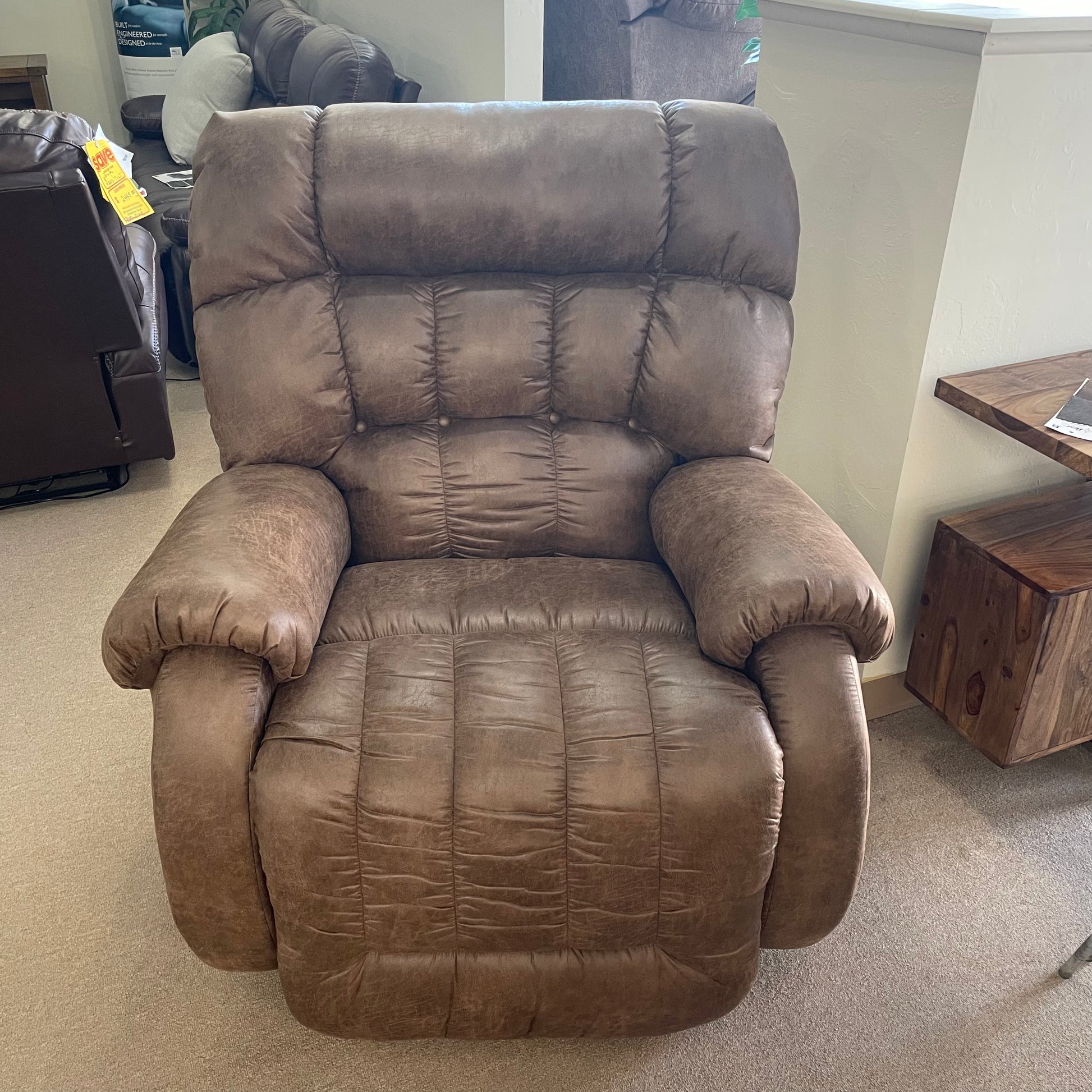 Very large big man’s recliner. Covered in a light brown “silt” next generation microfiber material. Proudly manufactured in the USA.