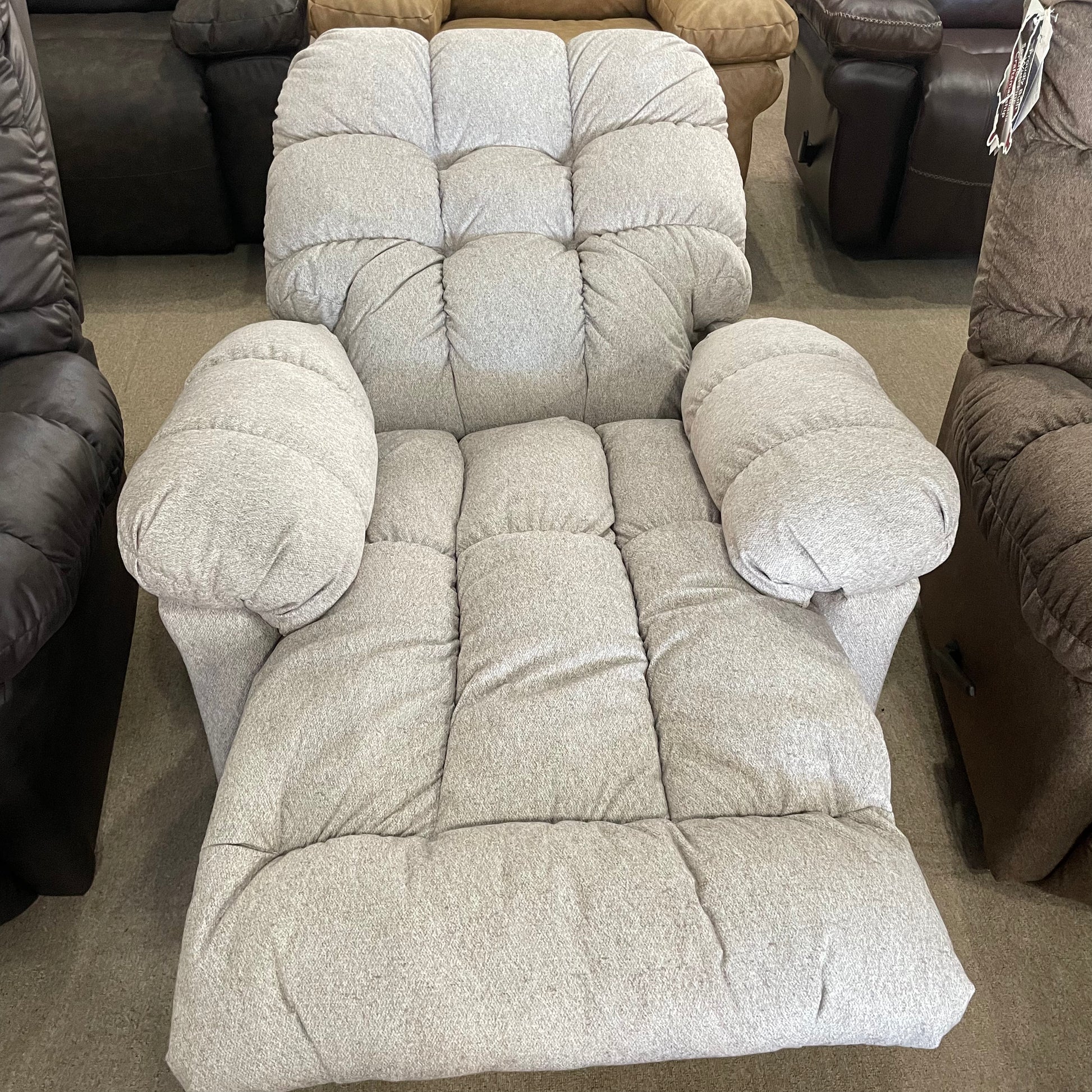 Medium size, tufted back, rocking recliner. Covered in a “beige” color.