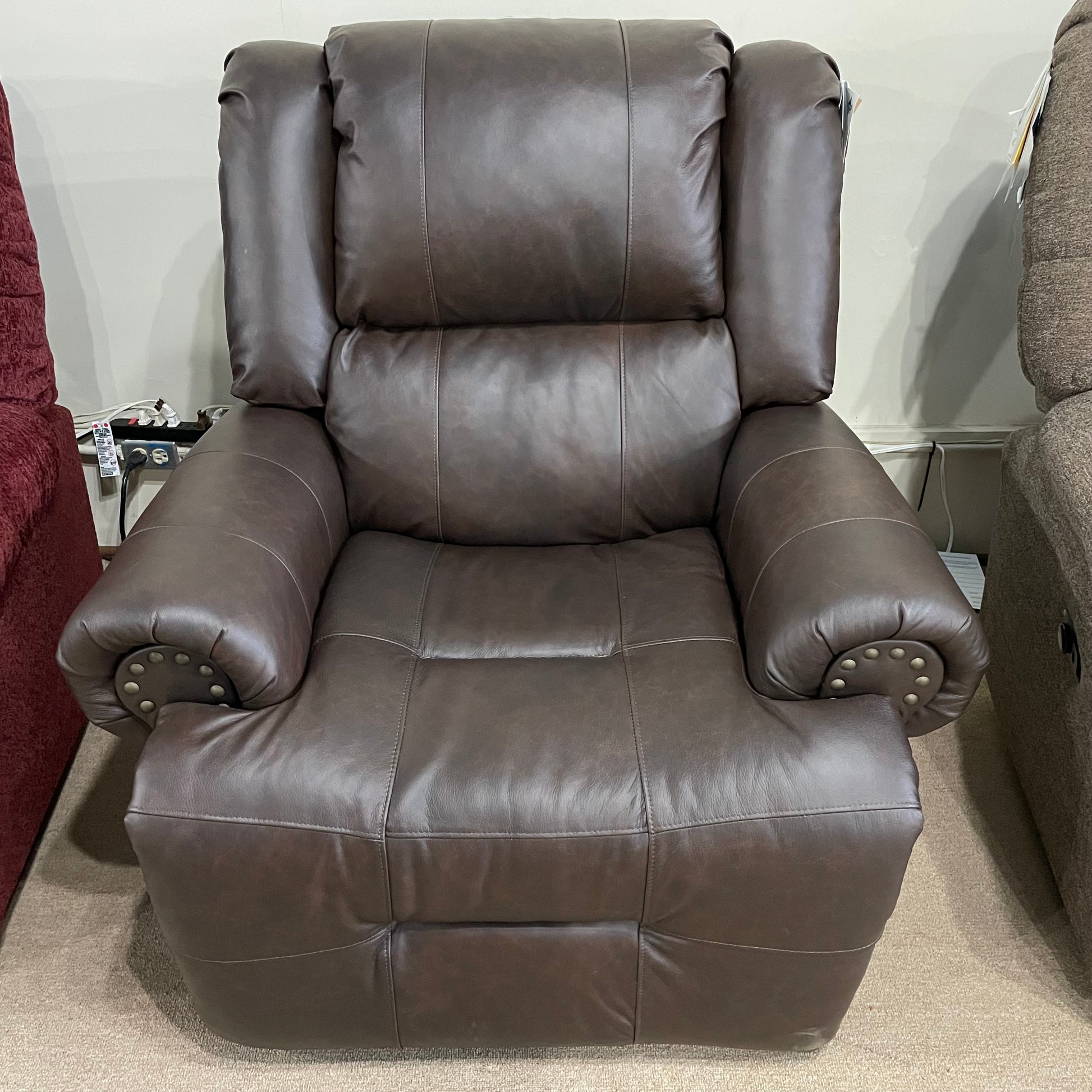 Built by Best Home Furnishings, this non-rocking recliner has power recline, power head tilt, and the controls on the RH side. Covered in a chocolate brown “Texas” leather.